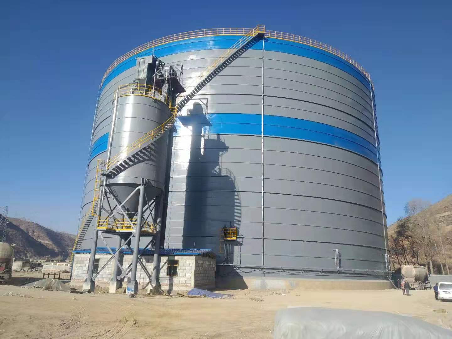 大型粉煤灰落地式钢板仓以其容量大、土地利用率高、自动化程度高、建设周期短、储存为全密封式储存形式,储存过程中没有任何污染,单位容积的投资低、等特点在物料存储、转运领域得到广泛应用。